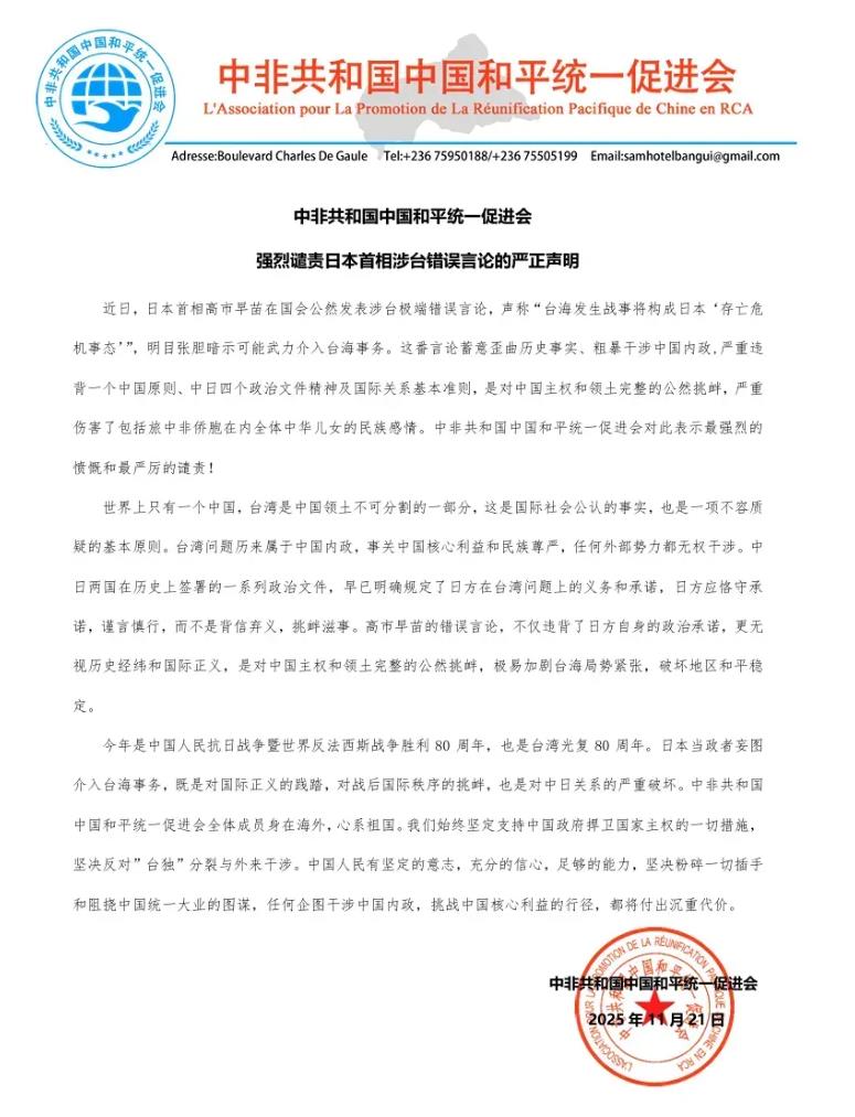 • 中非共和国中国和平统一促进会强烈谴责日本首相涉台错误言论 2025-11-26