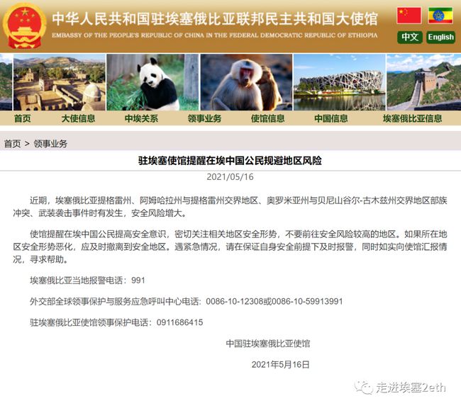 • 安全提醒:中使馆敦促在埃塞俄比亚中国公民规避地区风险 2021-05-18